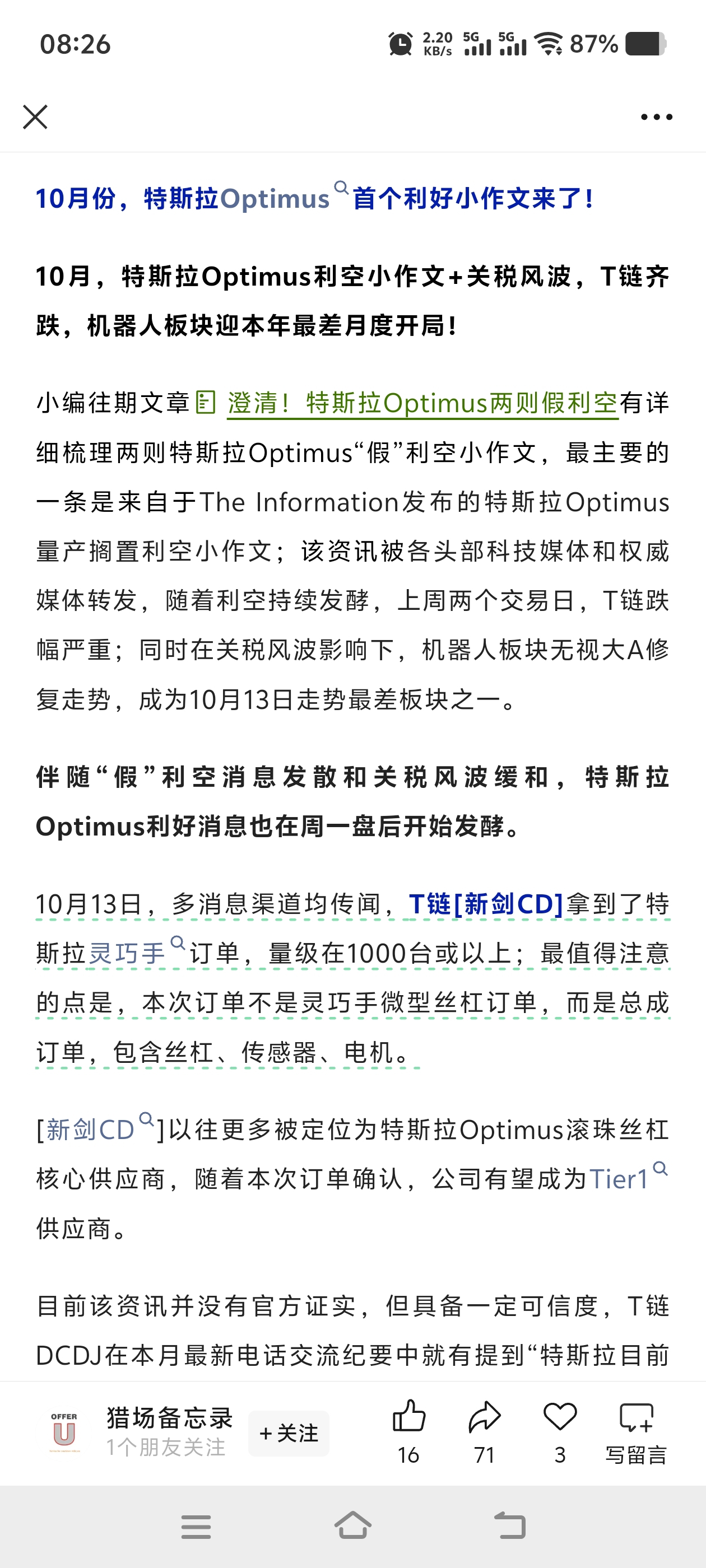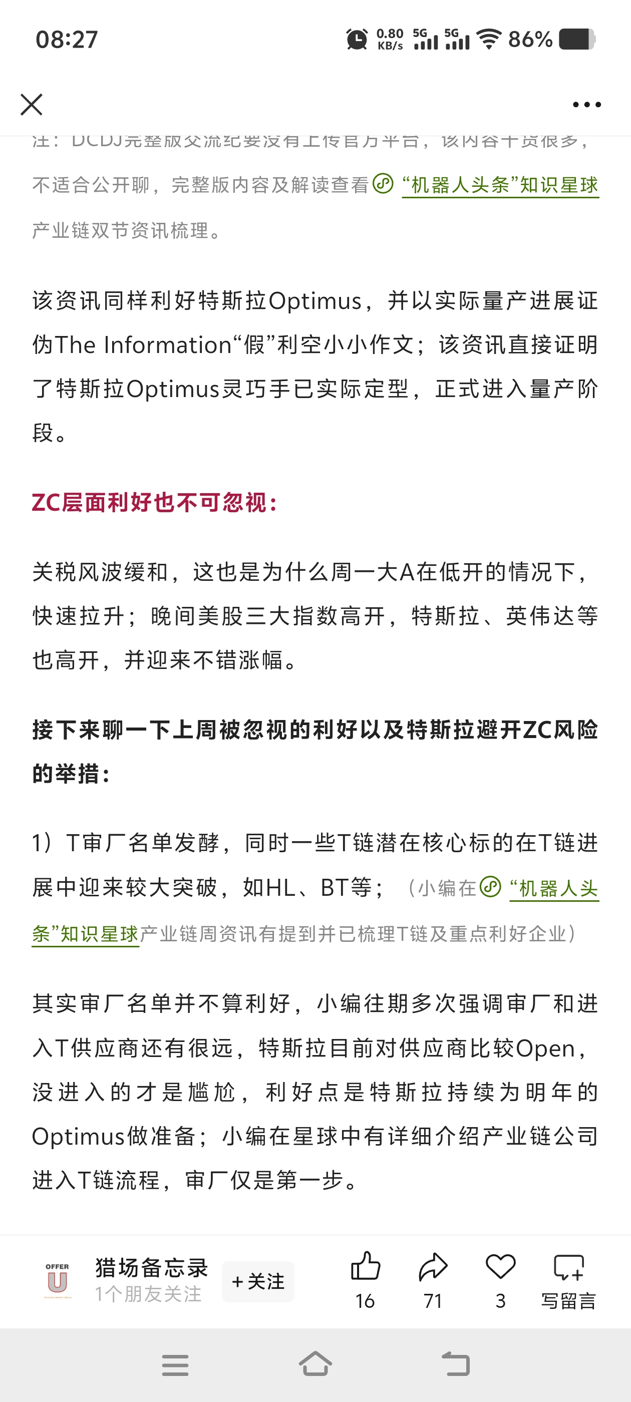 该资讯同样利好特斯拉Optimus,并以实际量产进展证伪TheInformati