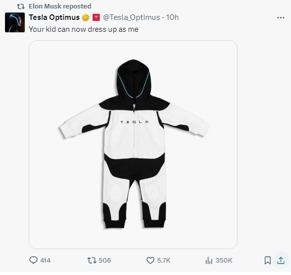 2025年10月16日,Tesla Optimus官方账号在社交媒体平台晒出擎天柱机器人版童装,并配文:Your kid can now dress up as me。