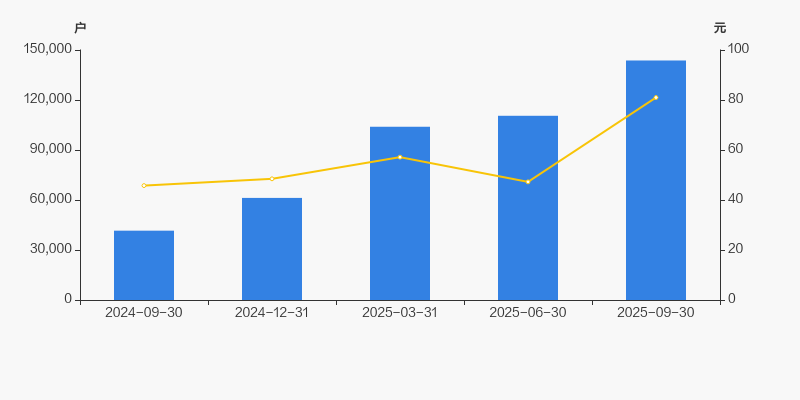 自2024年9月30日以来,公司股东户数连续4期上涨,截至目前增幅为245.48%。2024年9月30日至2025年9月30日区间股价上涨76.99%。