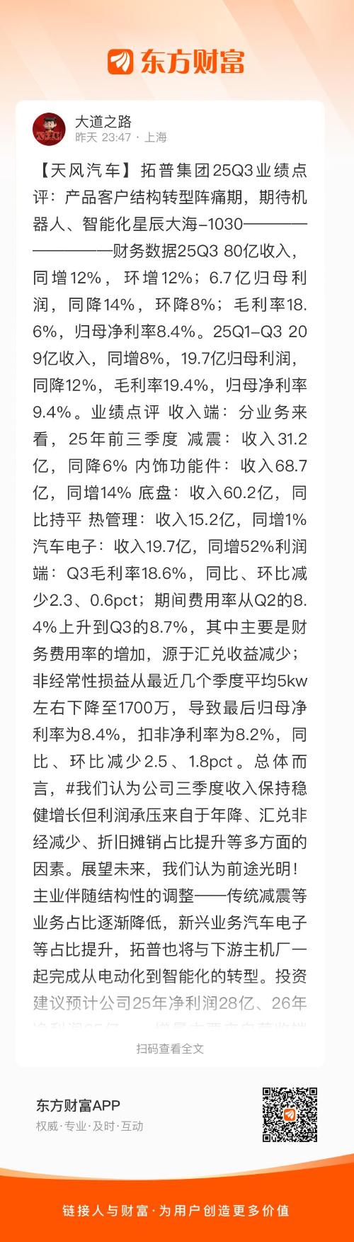 【天风汽车】拓普集团25Q3业绩点评:产品客户结构转型阵痛期,期待机器人、智能化星辰大海-1030—————————财务数据25Q3 80亿收入,同增12%,环增12%;6.7亿归母利润,同降14%,环降8%;毛利率18.6%,归母净利率8.4%。25Q1-Q3 209亿收入,同增8%,19.7亿归母利润,同降12%,毛利率19.4%,归母净利率9.4%。业绩点评 收入端:分业务来看,25年前三季度 减震:收入31.2亿,同降6% 内饰功能件:收入68.7亿,同增14% 底盘:收入60.2亿,同比持平 热管理:收入15.2亿,同增1% 汽车电子:收入19.7亿,同增52%利润端:Q3毛利率18.6%,同比、环比减少2.3、0.6pct;期间费用率从Q2的8.4%上升到Q3的8.7%,其中主要是财务费用率的增加,源于汇兑收益减少;非经常性损益从最近几个季度平均5kw左右下降至1700万,导致最后归母净利率为8.4%,扣非净利率为8.2%,同比、环比减少2.5、1.8pct。总体而言,#我们认为公司三季度收入保持稳健增长但利润承压来自于年降、汇兑非经减少、折旧摊销占比提升等多方面的因素。展望未来,我们认为前途光明!主业伴随结构性的调整——传统减震等业务占比逐渐降低,新兴业务汽车电子等占比提升,拓普也将与下游主机厂一起完成从电动化到智能化的转型。投资建议预计公司25年净利润28亿、26年净利润35亿——增量主要来自营收端约70亿增量,包括小米30亿、问界20亿、奇瑞、吉利等其他客户20亿等,净利率10%,带来7亿左右的利润增量。#我们认为公司目前处在从产品到客户结构调整与优化的阵痛期——从汽车依赖T客户到为自主车企以及外资车企全面配套;从产品以传统的减震内饰轻量化底盘到拓展智能底盘的XYZ;从机器人份额悲观到预期不断上修,我们看到的还是一个充满韧性的拓普,朝着时代的方向一往直前。———————————欢迎交流:孙潇雅/王彬宇