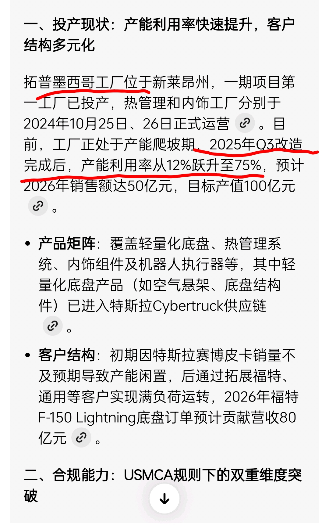 今晚突然看到有人说什么特斯拉汽车零部件要去中国化。首先这个是25年4月关税战那会就有的事。所以拓普均胜这些很早就在布局墨西哥和泰国工厂,并且逐渐提升产能。q3业绩会上拓普高层也说了,墨西哥工厂q3开始会进一步提升产能。后面对美供应会全部迁移到墨西哥工厂。只要本地制造成分高于75%,不属于中国制造,这一点可以放心。不会影响对海外客户的供应。