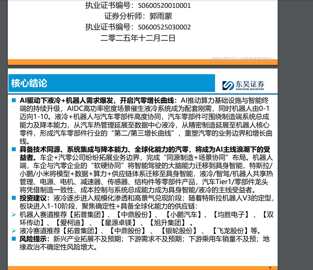 传统汽零恢复20%以上增长,液冷和机器人2个高爆发赛道加持。拓普还是最确定的核心