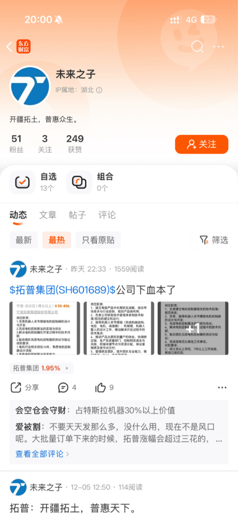$拓普集团(SH601689)$ 我是真TM服了,这个人成天累不累?搞得自己像个专家一样,整天股吧就这个毛像个小丑一样的蹦跶来蹦哒去的,一会唱多一会唱空,TM的精力真足,礼拜天都还在股吧里BB来BB去的