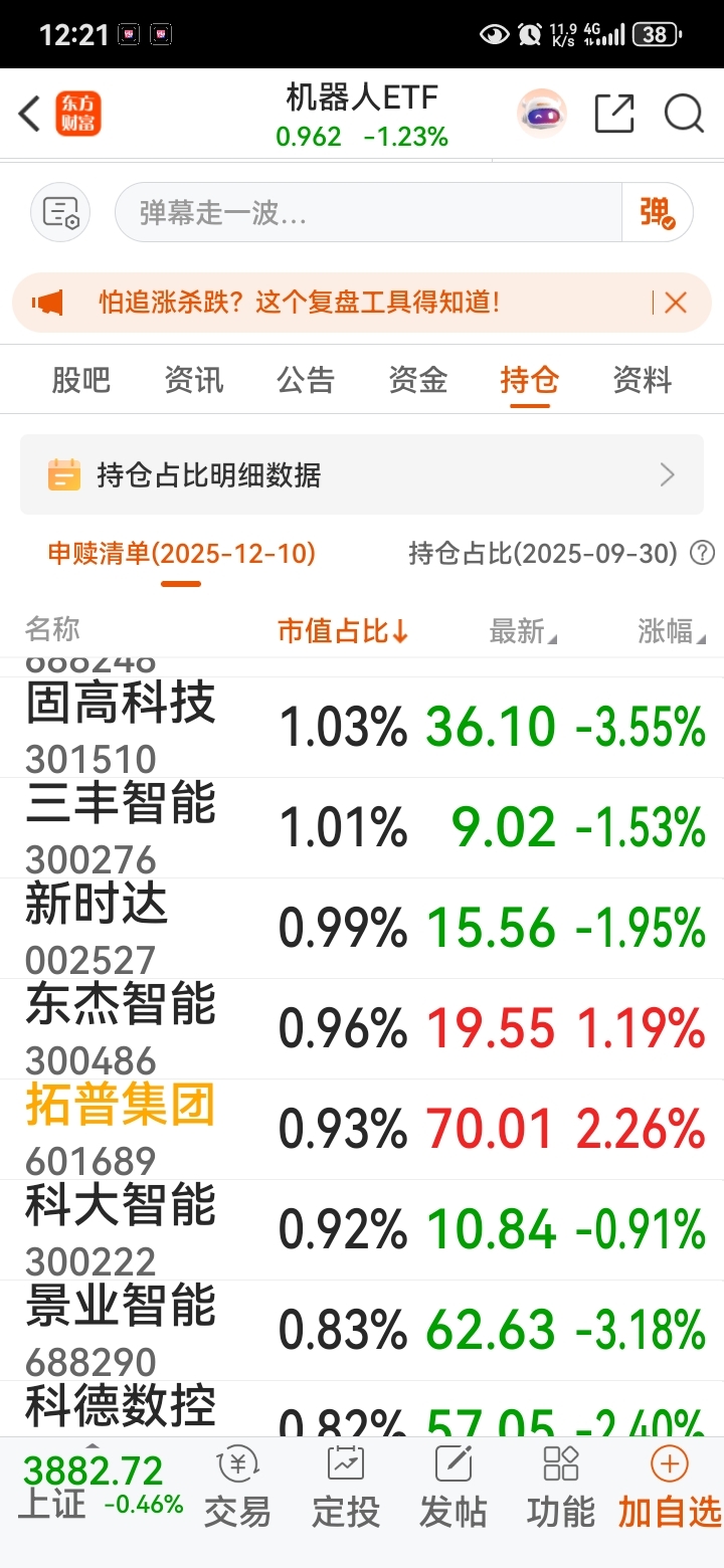 $拓普集团(SH601689)$ 拓普集团(SH601689)今日正式纳入中证机器人ETF(目前总规模约250亿),机构已开始买入,目前持仓比例为0.93 %,预计15日(下周一)调仓结束时,其持仓比例将提升至8%-10%,拓普集团将成为其第二大持仓股。此举将在两天内(11号、12号)为拓普集团带来至少20亿增量资金进驻。