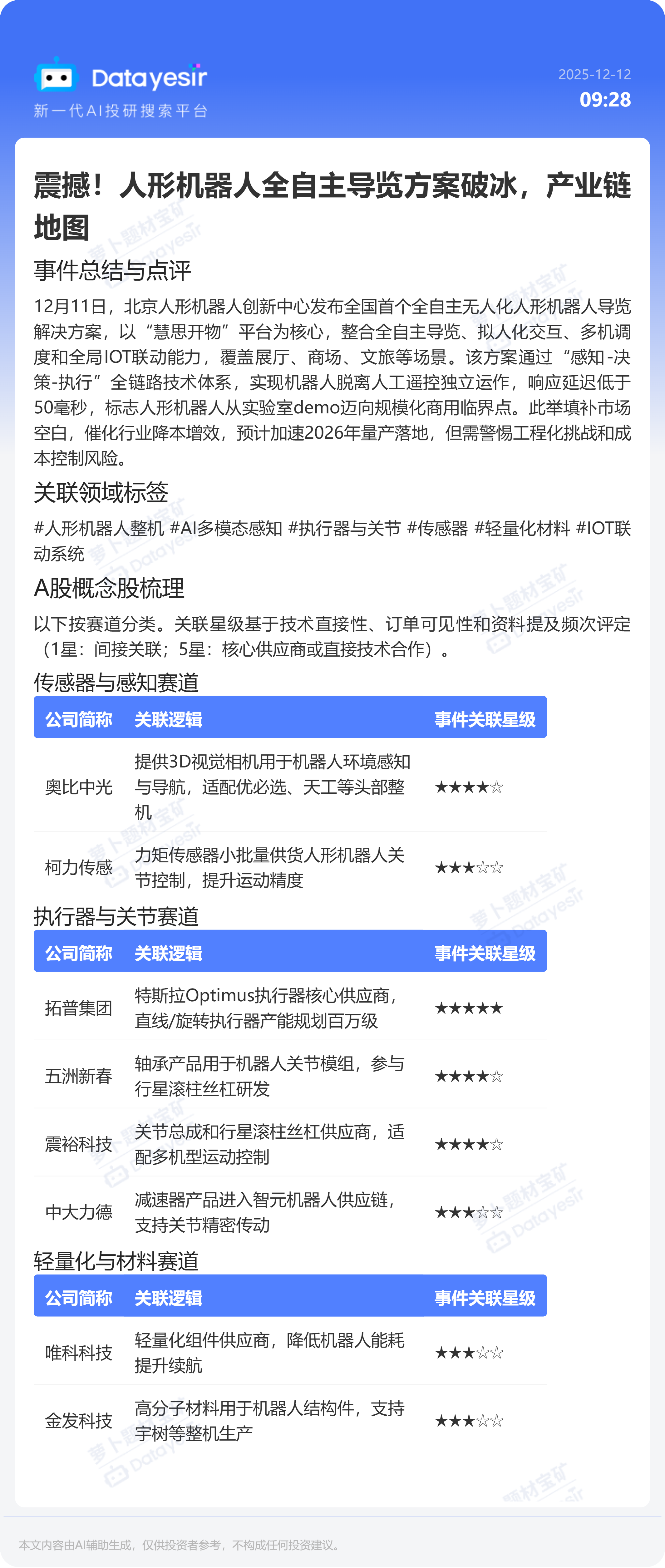 震撼!人形机器人全自主导览方案破冰,产业链地图