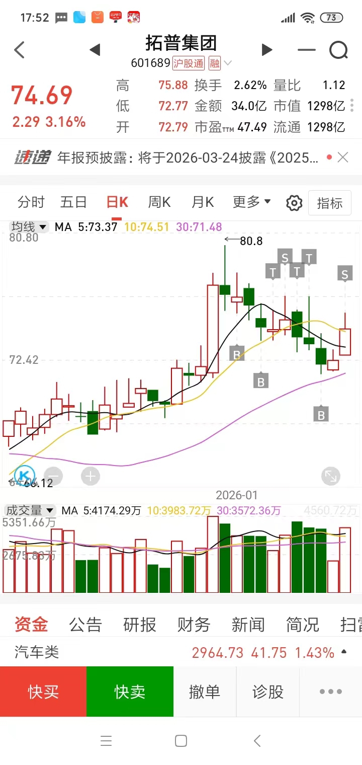 $拓普集团(SH601689)$ 76.9买的,几次做t,74卖了,赚了4个多点。