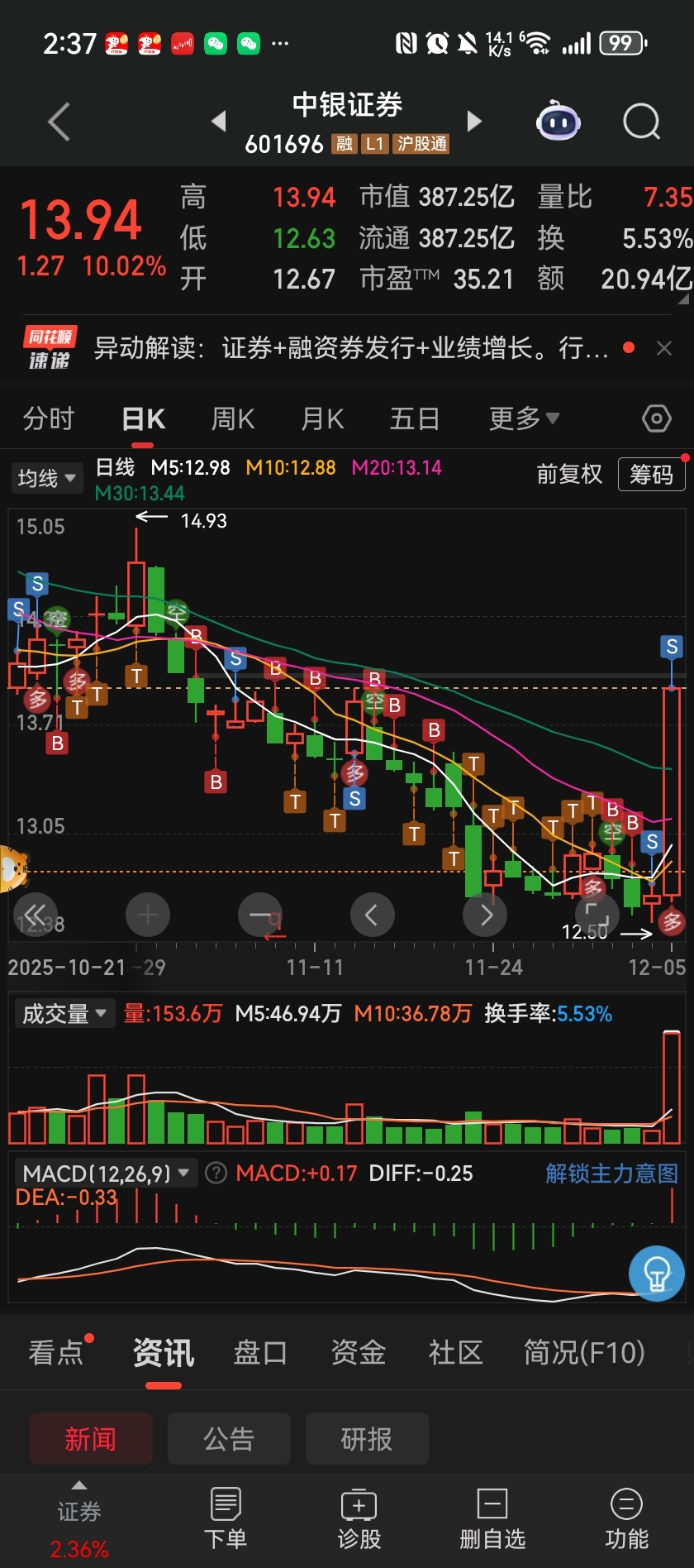 $中银证券(SH601696)$ 睡个午觉居然涨停了 先卖四分之一