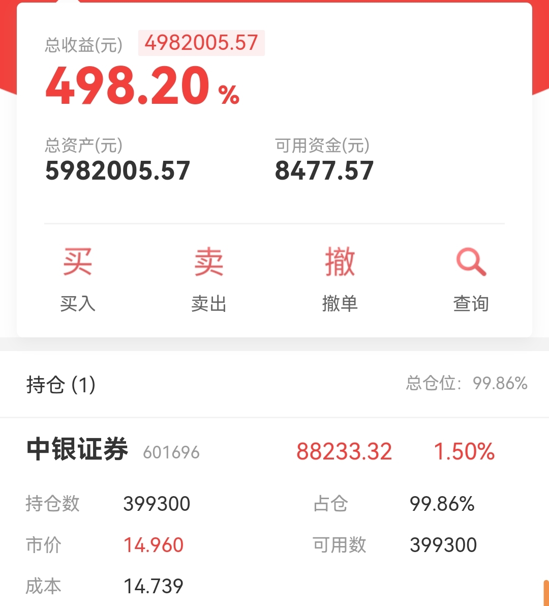 $中银证券(SH601696)$ 也不怕你们笑话笑话,拿个快两个月了都没动一下,今天红了。