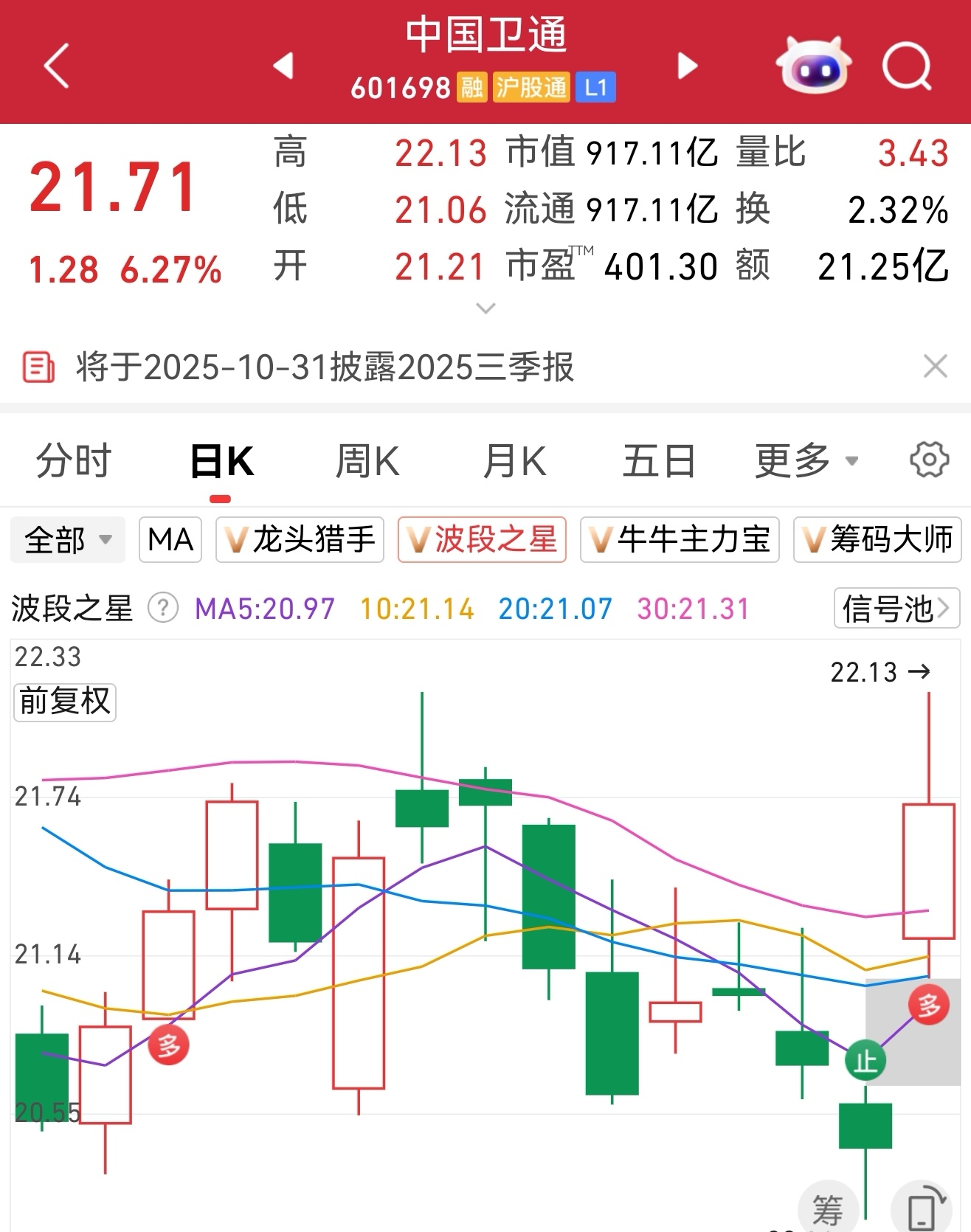 $中国卫通(SH601698)$ 波段做多信号已出,耐心持有。