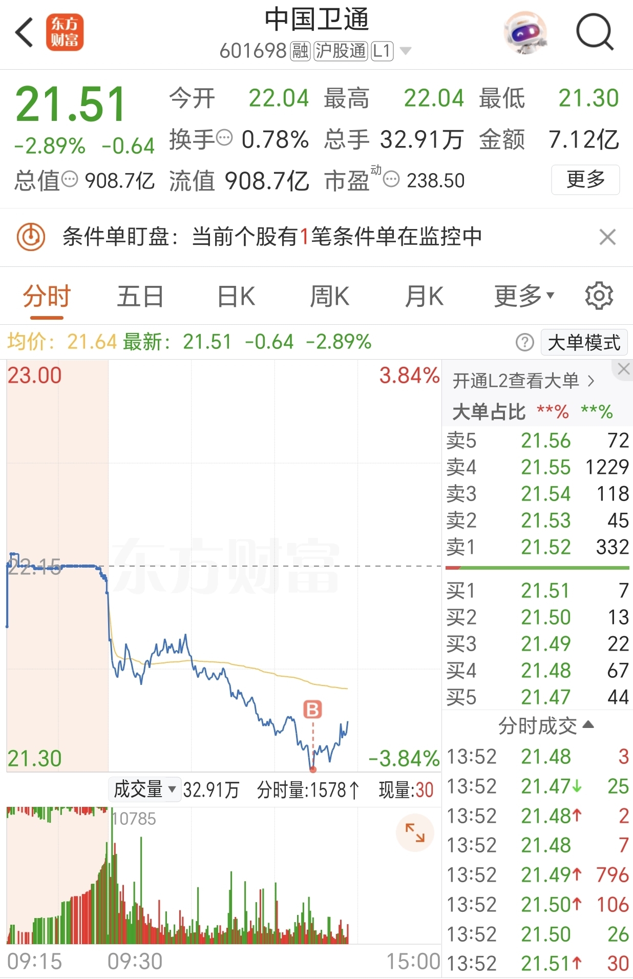 $中国卫通(SH601698)$ 今天的买单已经挂22.88委托卖出了,成不成交看缘分