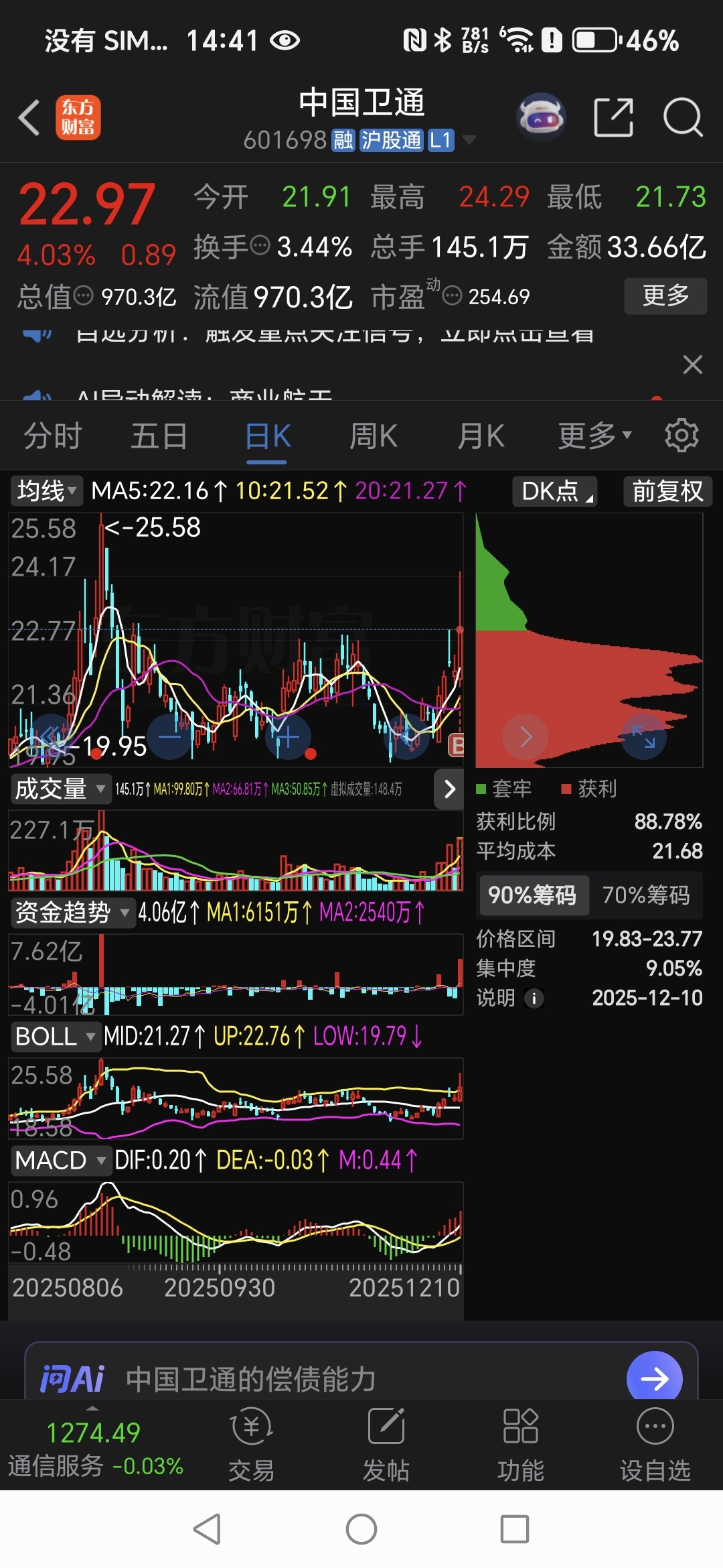 $中国卫通(SH601698)$ 这么强势进100手玩玩!明天尾盘前就出货!