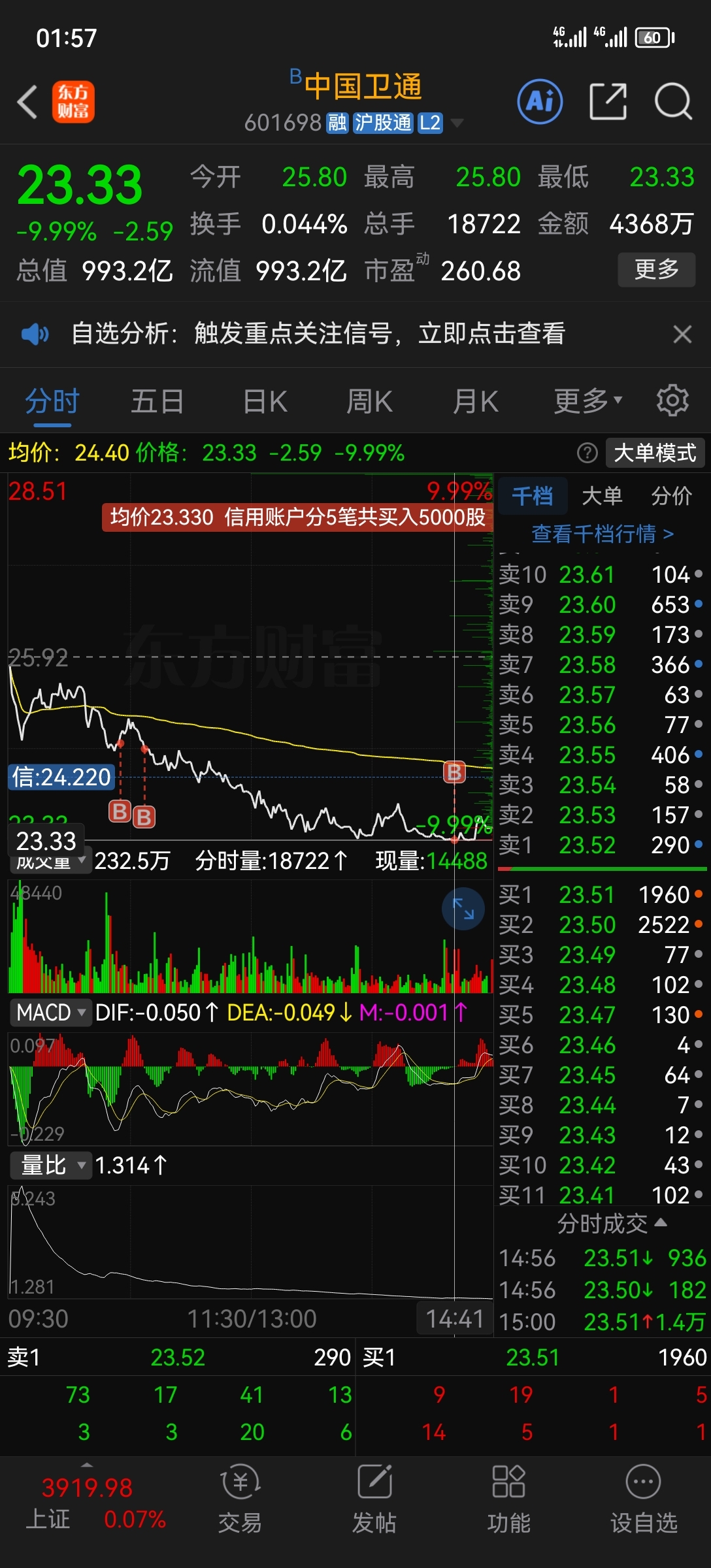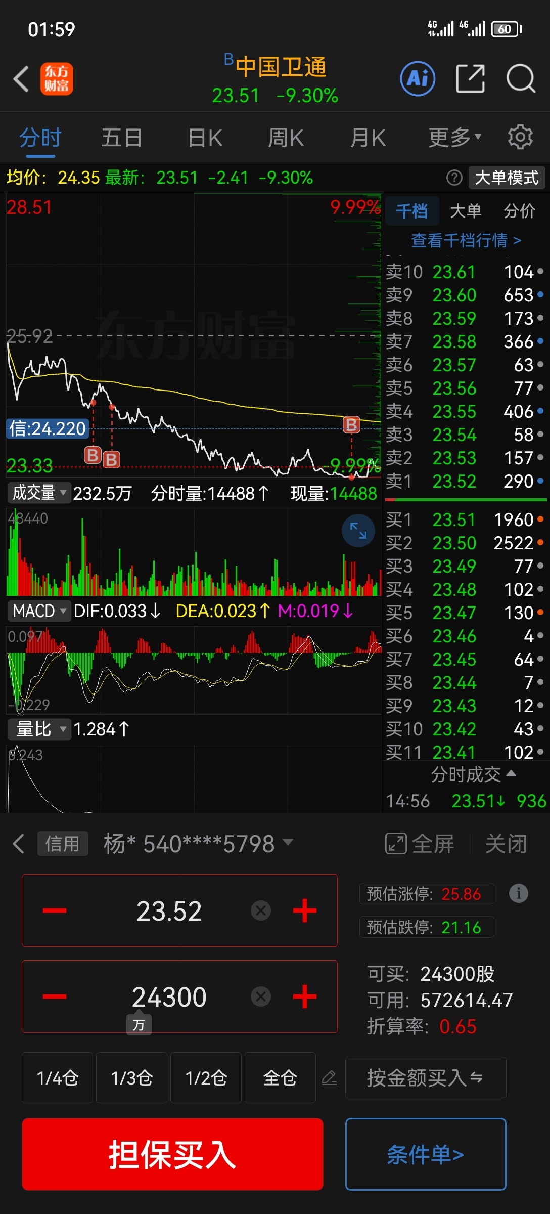 一单5000股,进了15000股,先打个头阵,我希望他继续下跌,我还想继续买,我还能买24300股。。。