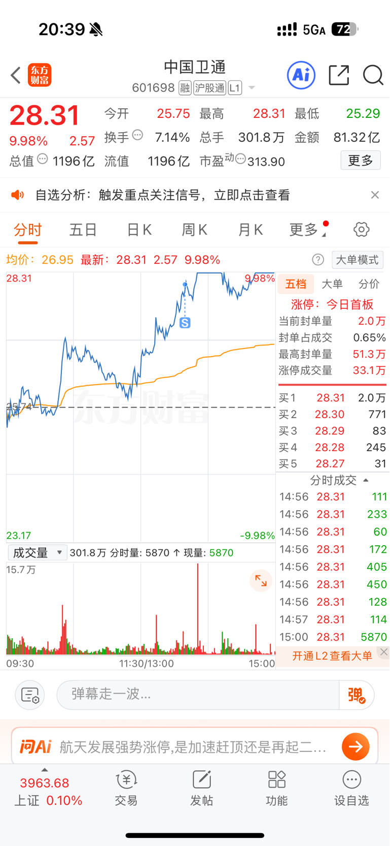 $中国卫通(SH601698)$ 28清了8成,周一能否做套一波