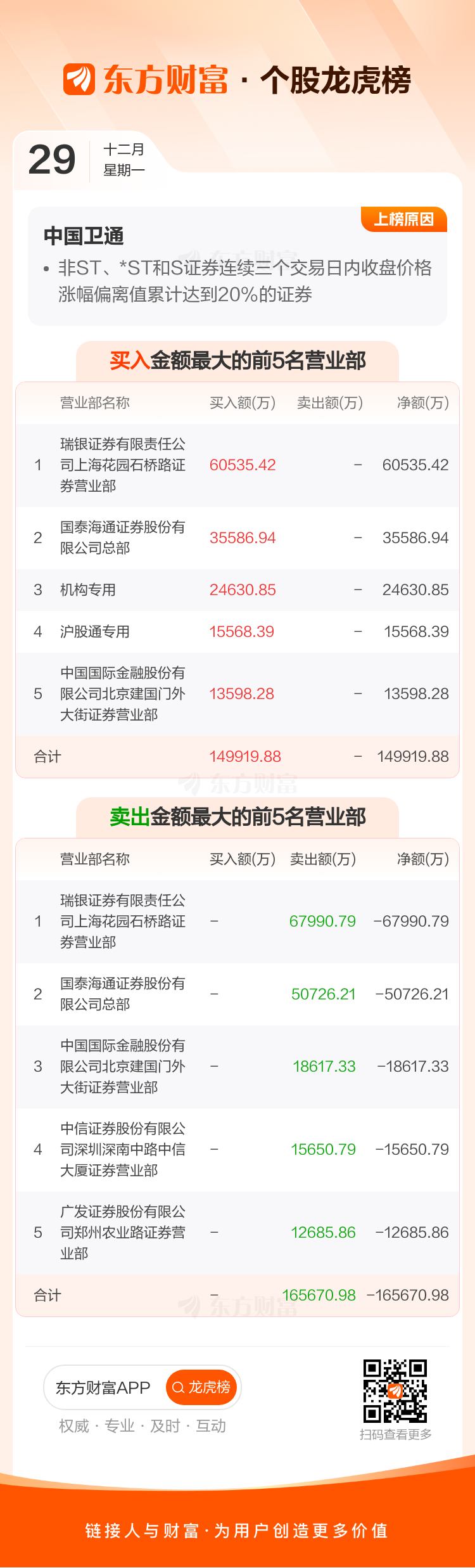 交易所2025年12月29日公布的交易公开信息显示,中国卫通因成为非ST、*ST和S证券连续三个交易日内收盘价格涨幅偏离值累计达到20%的证券上榜。中国卫通当日收报30元,涨跌幅5.97%,换手率7.10%,成交额87.47亿。异常期间12月25日至12月29日,期间涨幅22.15%,累计偏离值21.53%,区间成交额212.78亿。