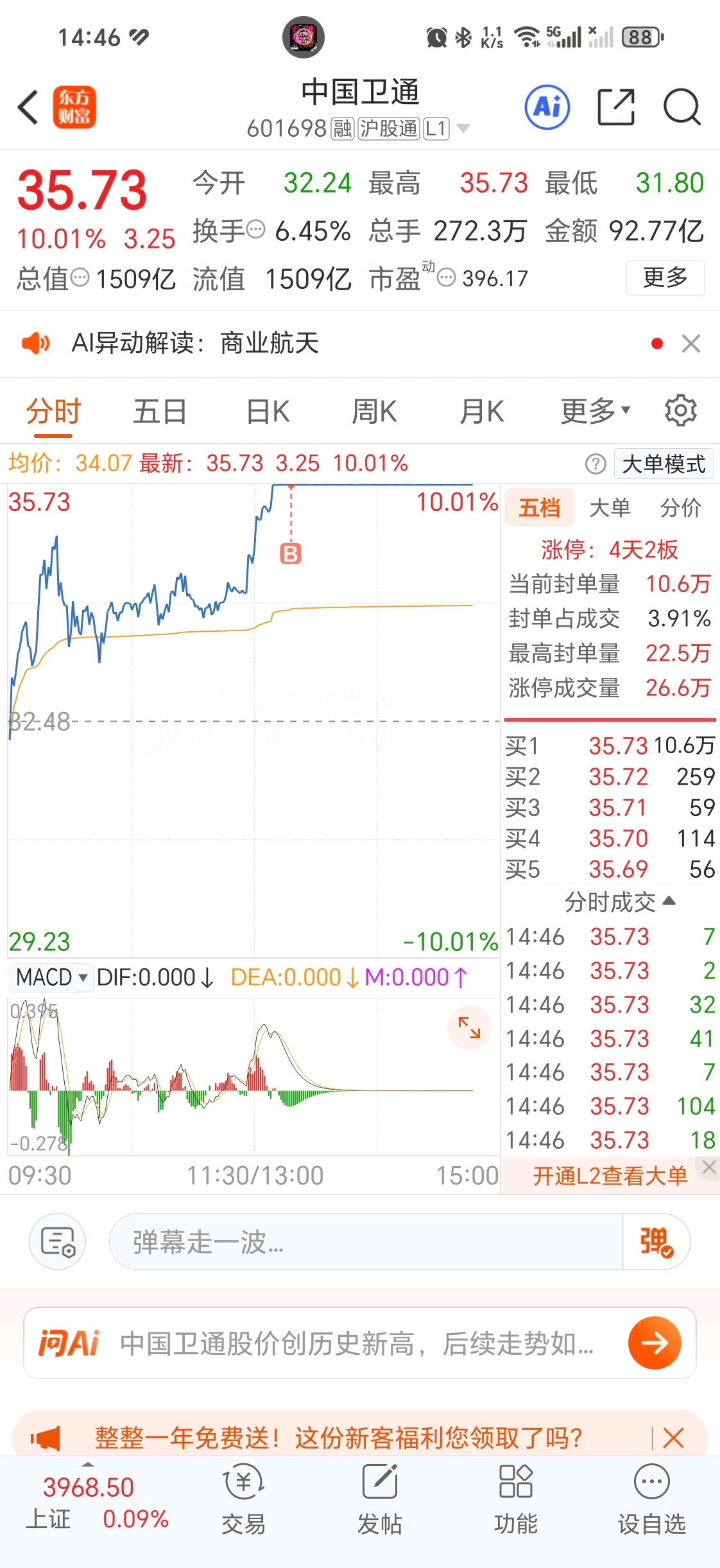 $中国卫通(SH601698)$ 我第一天入场就吃了个涨停