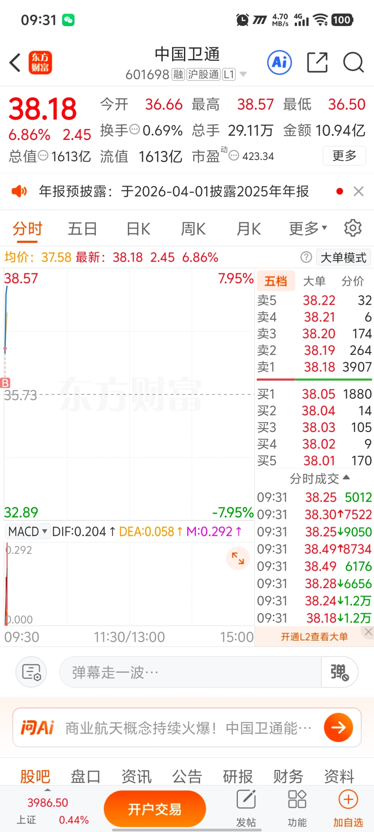 $中国卫通(SH601698)$  上车