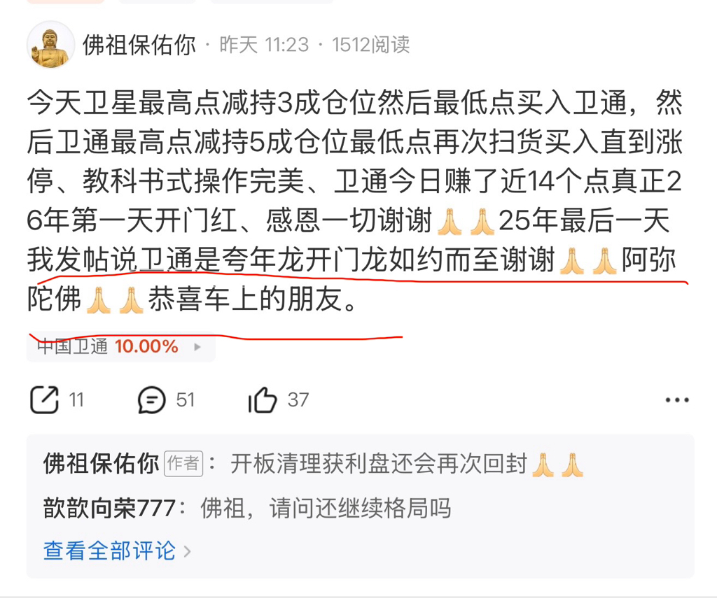 佛祖一直说卫通和卫星是我见过最强的主力、机构抱团、游资也合力锁仓、同样也感恩大家一起合力、佛祖一直发帖让大家格局拿住、佛祖今天吃了13个点谢谢,谢谢,阿弥陀佛