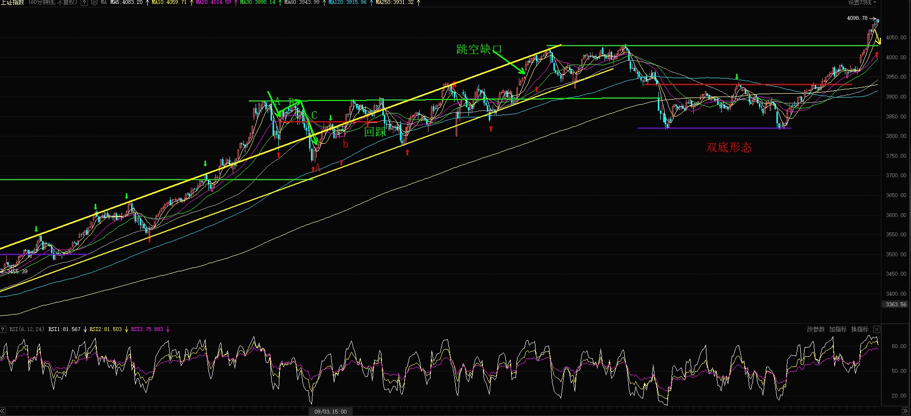 今天大盘又继续创下10年内新高4098点,从60分钟分时图来看现在已经开始有超买