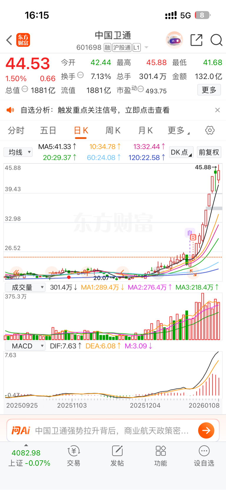 $中国卫通(SH601698)$ 想当初24年11月刚入股市,卫通就很猛,没吃上,现在吃上了,比之前更猛