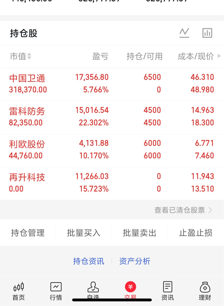 新买入中国卫通,同时卖出再升科技。目前持仓保持3只,分别是中国卫通、利欧股份和雷科防务,都是自己看好的标的,后续会重点关注走势变化。没有复杂操作,就是跟着自己的判断来,不追涨不盲目跟风,慢慢观察调整。