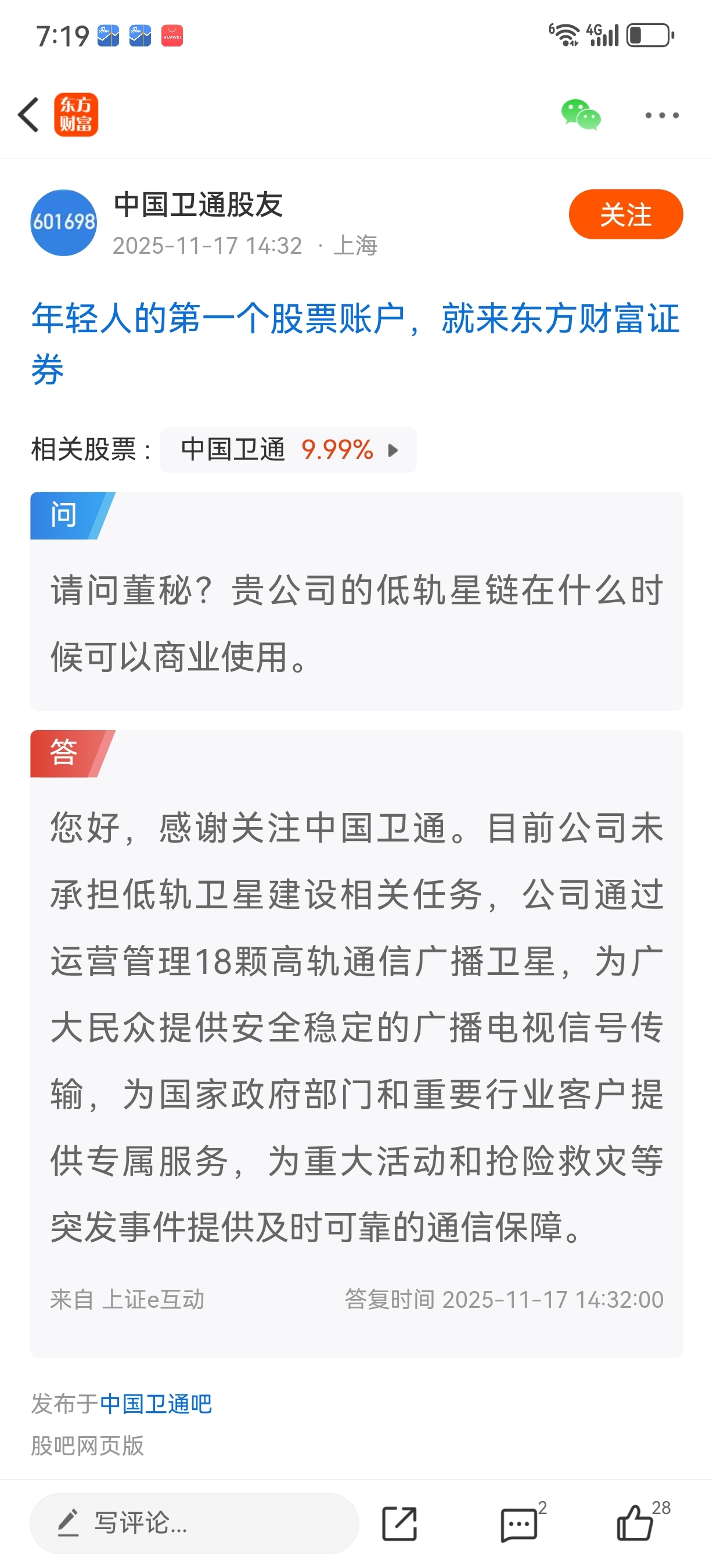 中国卫通不参与低中轨卫星组网运营,这是重大利空,这次炒作是错误的