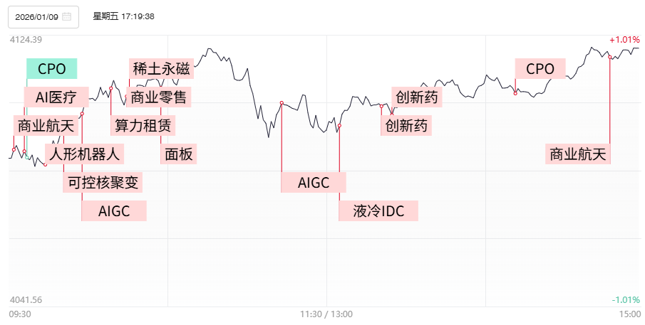 财联社1月12日电,上个交易日市场震荡拉升,沪指高开高走突破4100点,深成指涨超1%。全市场超3900只个股上涨。沪深两市成交额3.12万亿,放量3224亿,时隔73个交易日后再度站上3万亿大关,历史第五次突破3万亿。1)广州市发布《广州市加快建设先进制造业强市规划(2024-2035年)》,提出以建设先进的系列化运载火箭产业基地为牵引,力争成为中国商业航天新一极。商业航天在近期利好层出不穷推出提振下,延续此前火热表现,多只卫星ETF大涨超6%,个股方面中国卫通总市值历史首次突破2000亿,银河电子、乾照光电、鲁信创投、金风科技等多股实现连板晋级。2)大模型流量红利被视为互联网流量第三次革命,AI广告营销行业的GEO概念持续受到市场关注,引力传媒反包涨停走出5天4板,易点天下、天龙集团、利欧股份、浙文互联等多股封板,AI营销龙头蓝色光标收涨超14%,距离历史高点仅一步之遥。而受到OpenAI发布ChatGPT健康的消息刺激,AI医疗、AI制药概念也持续火爆,泓博医药、美年健康、国新健康等多股封涨停。3)工信部印发《工业互联网和人工智能融合赋能行动方案》,强化工业智能算力供给。算力租赁方向延续强势,农尚环境、华胜天成、大位科技、恒为科技等多股涨停,润泽科技、奥飞数据双双涨超10%。4)越南等将稀土列为国家战略资源并禁止原矿出口,国内稀土氧化物以及钨产品等价格持续上调。小金属为首的有色板块全天表现火热,厦门钨业、章源钨业、金钼股份、云南锗业涨停,华锡有色、洛阳钼业双双刷新历史高点。