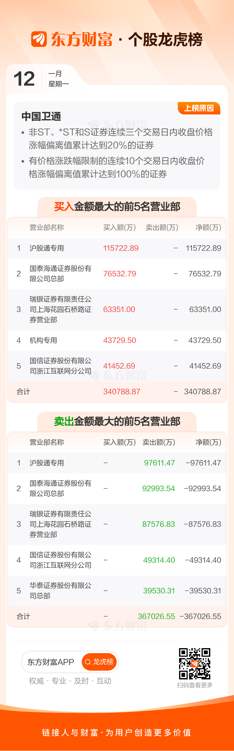 交易所2026年1月12日公布的交易公开信息显示,中国卫通因成为非ST、*ST和S证券连续三个交易日内收盘价格涨幅偏离值累计达到20%的证券、有价格涨跌幅限制的连续10个交易日内收盘价格涨幅偏离值累计达到100%的证券上榜。中国卫通当日收报53.88元,涨跌幅10.00%,换手率6.22%,成交额138.23亿。异常期间1月8日至1月12日,期间涨幅22.82%,累计偏离值20.87%,区间成交额400.96亿。异常期间12月26日至1月12日,期间涨幅109.32%,累计偏离值104.12%,区间成交额1142.39亿。