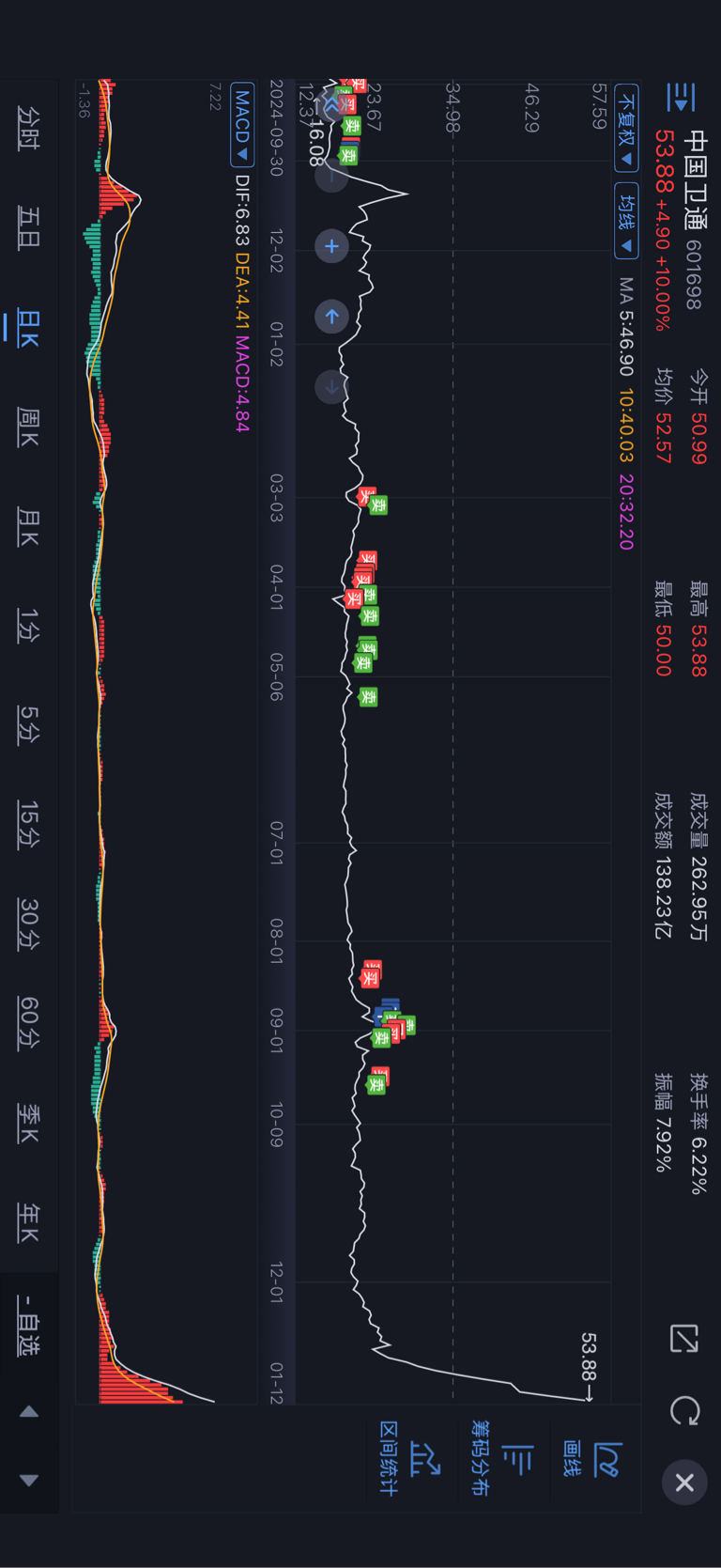 $中国卫通(SH601698)$ 家人们 就说有没有和我一样的 从2019年开始 10块多开始盘你 这么多年的老伙计却完美错过了你!现在的你让我高攀不起 天天不敢买天天你再涨