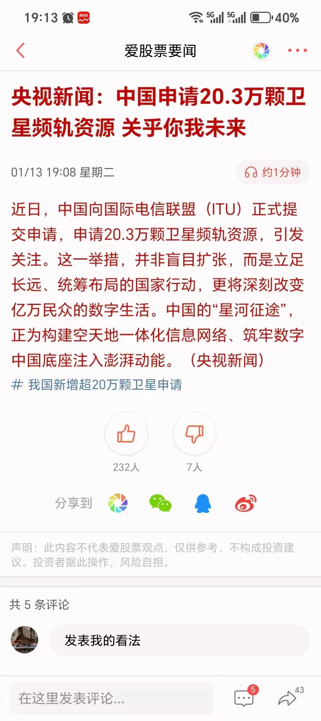 $中国卫通(SH601698)$ 央视新闻中国申请20.3万颗卫星频道资源关乎你我未来