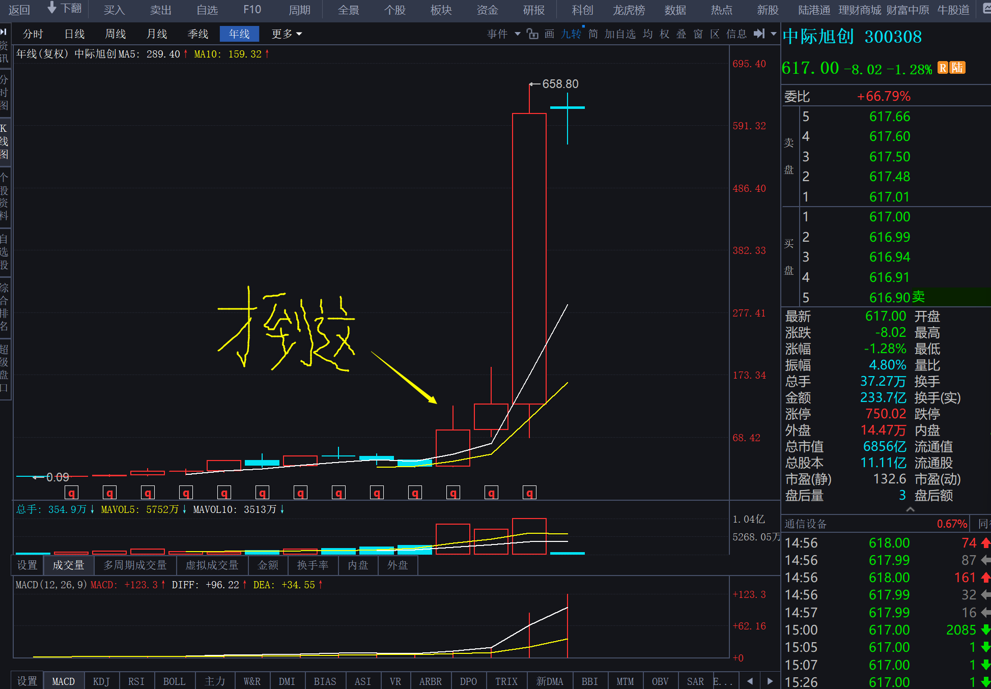 技术上看大视野年线,才到易中天的2023年年线位置(见上图我黄色箭头标出),上面空间巨大