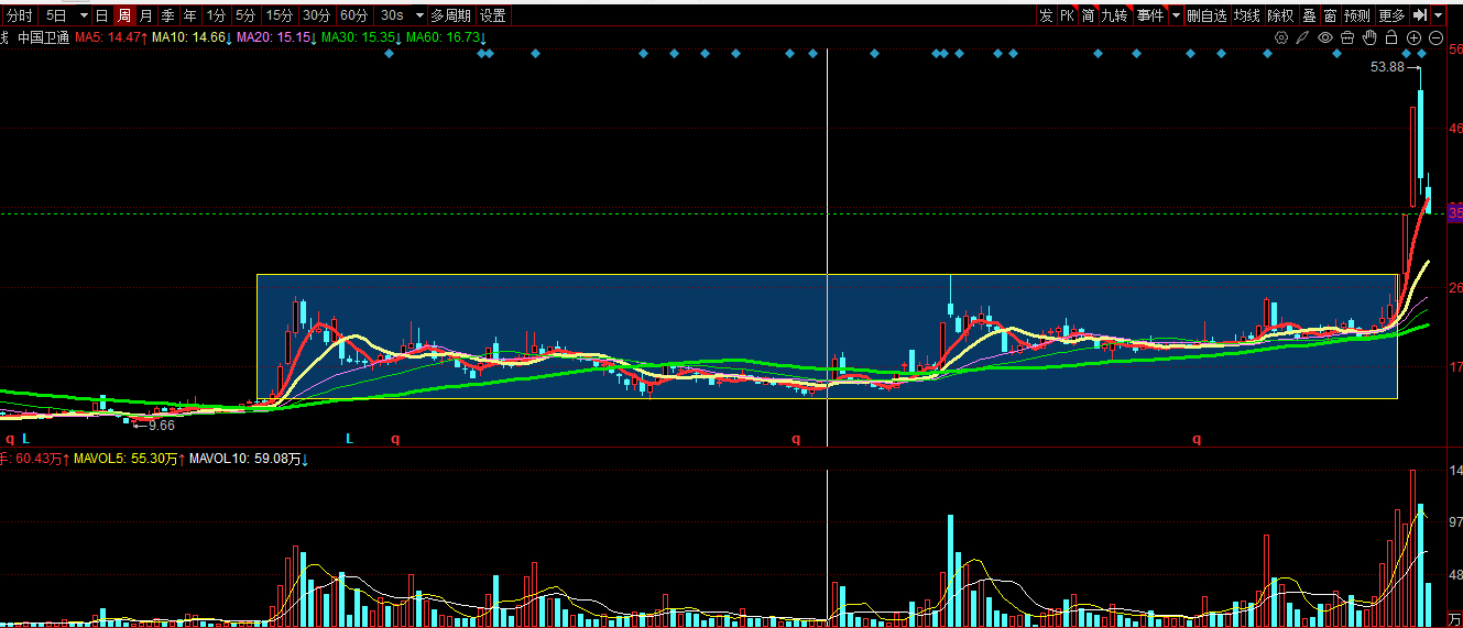 $中国卫通(SH601698)$ 箱体横盘快3年,周线刚放量突破箱体行情就结束了?机构就赚这么点?又是商业航天,又是今年定调的大方向,不要天天盯着分时,日线,macd技术指标看,多看看成交量周线月线,成交量在那,真金白银堆出来的,做不了假,调整很正常,才能涨的更高,坚定看好上100