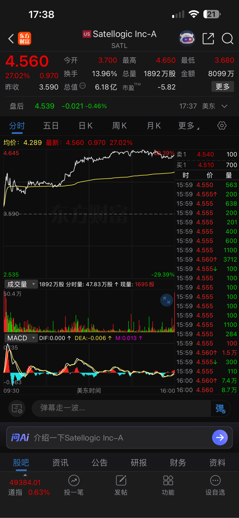 美股卫星通讯技术公司今天收盘涨幅27.02%(Satellogicinc-A)
