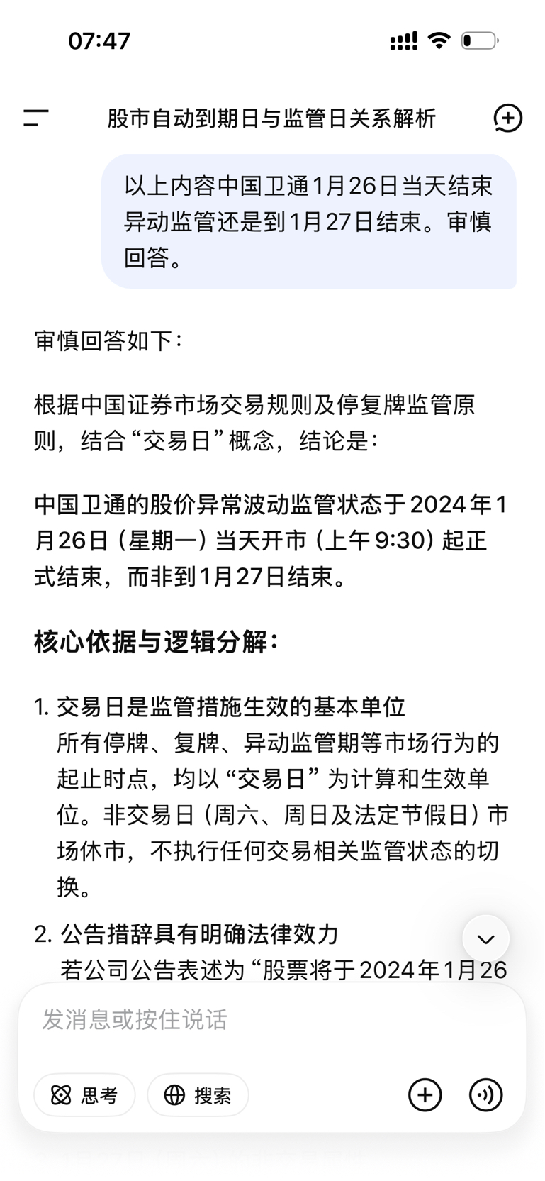 $中国卫通(SH601698)$ 关于异动问题哦,那些不懂的,我劝大家要么去问问人工智能,要么去给上证或者深证打电话求证,而不是传谣言。