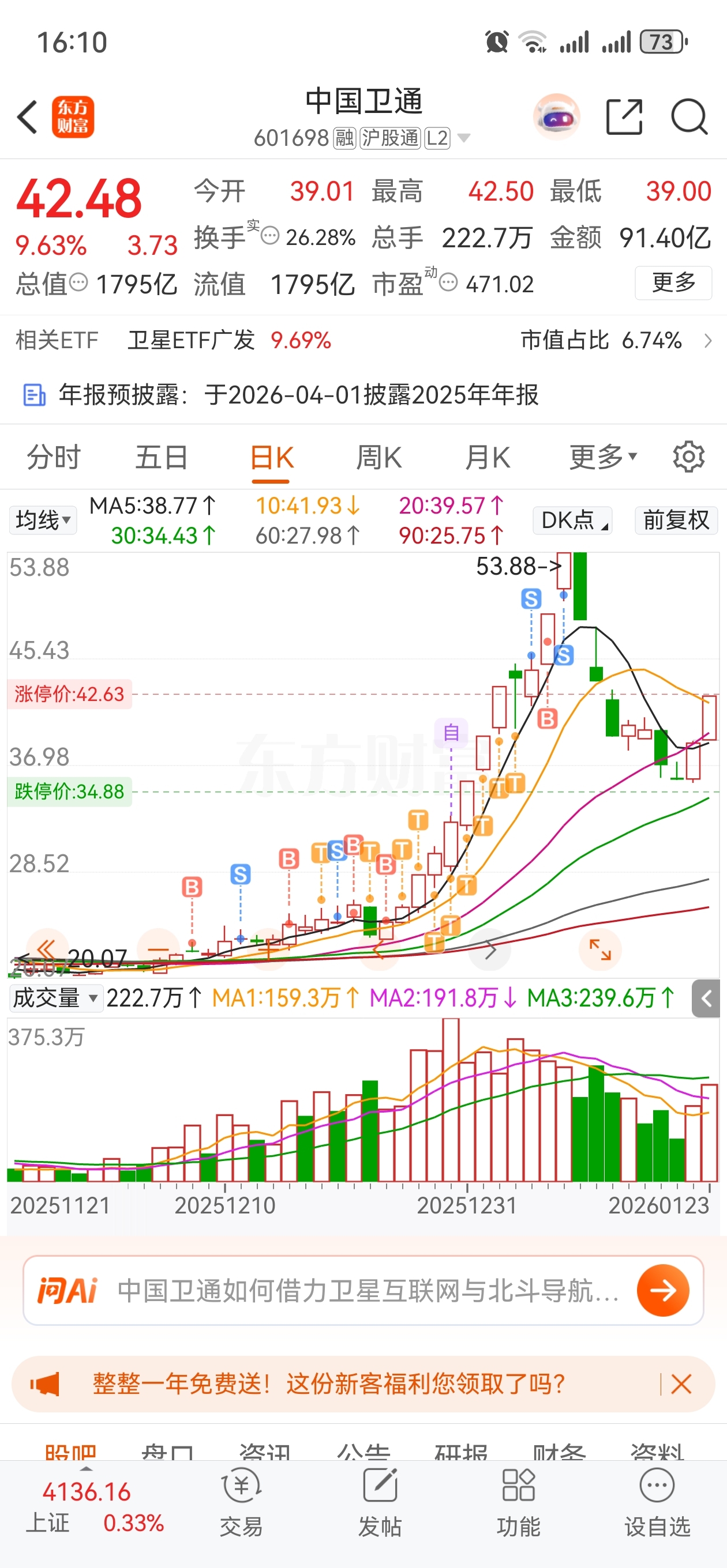 $中国卫通(SH601698)$ 什么主力游资在趋势面前不过是个玩具,所谓的压不住异动就是主力不想一下子把货出的太猛,看到卡异动三个字,我都想笑。要是真压不住热火朝天的时候,航天一样给你摁下来怎么解释?主力那些小心思被我看的明明白白在高位,而我也早功成身退。吃的饱饱,想知道后续这个股的走法扣波一,我简单的说一下