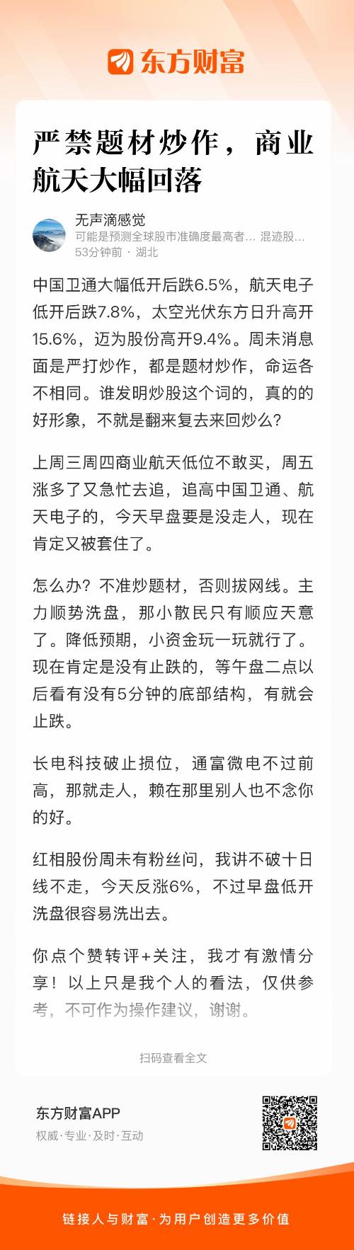 上周三周四商业航天低位不敢买,周五涨多了又急忙去追,追高中国卫通、航天电子的,今天早盘要是没走人,现在肯定又被套住了。
