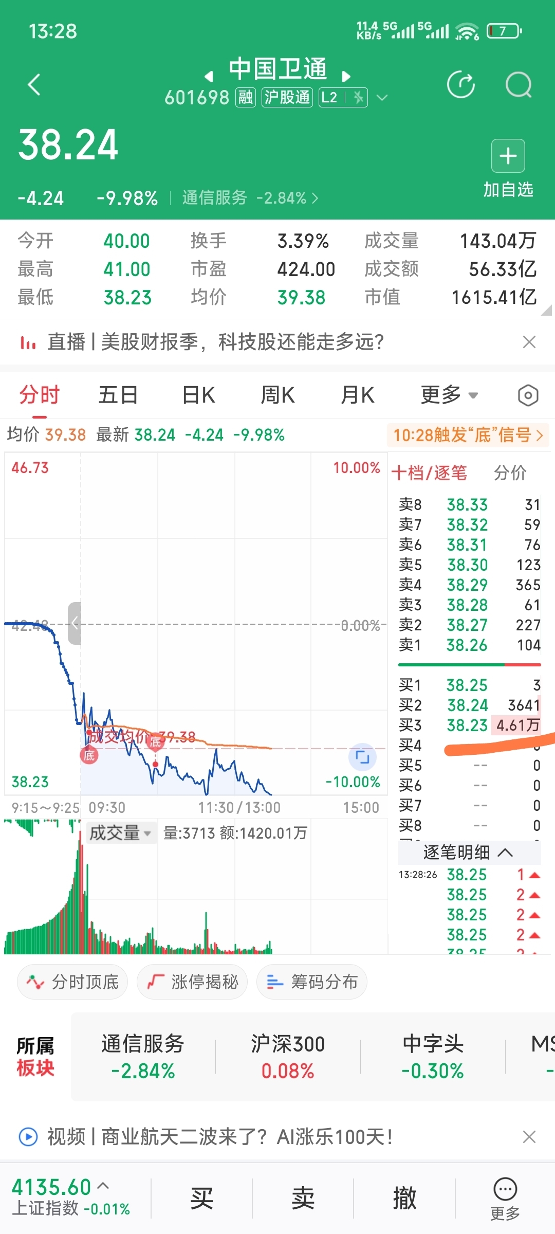 $中国卫通(SH601698)$ 有人在跌停板捡带血筹码
