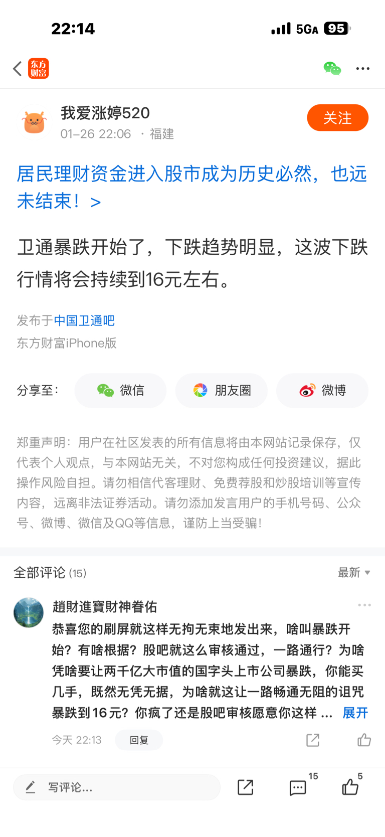 $中国卫通(SH601698)$ 问问股吧审核,这样的文字是怎么通过的,一个文字就这几个字就刷屏上市公司要从38元暴跌到16元,无凭无据地散布谣言,且在这里畅通无阻?