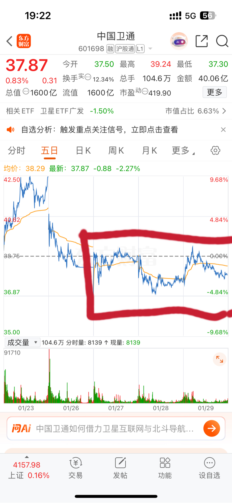 $中国卫通(SH601698)$ 股价在这个区间震荡我暂时看作是洗盘,毕竟26号跌停抄底加仓的人不少,洗了三天总体没完全走坏,不过未来几天不能再来一根大阴线,出现的话就不是洗盘了,也不能震荡太久,超过10天筹码结构就坏了,如果卫通能在年前拉到45左右稳住,一个假期的发酵节后完全有机会立马新高。这种看着要起二波的k线是最难受人的,只能看自己信心了相信他就拿住吧,年前锁仓十万这里了