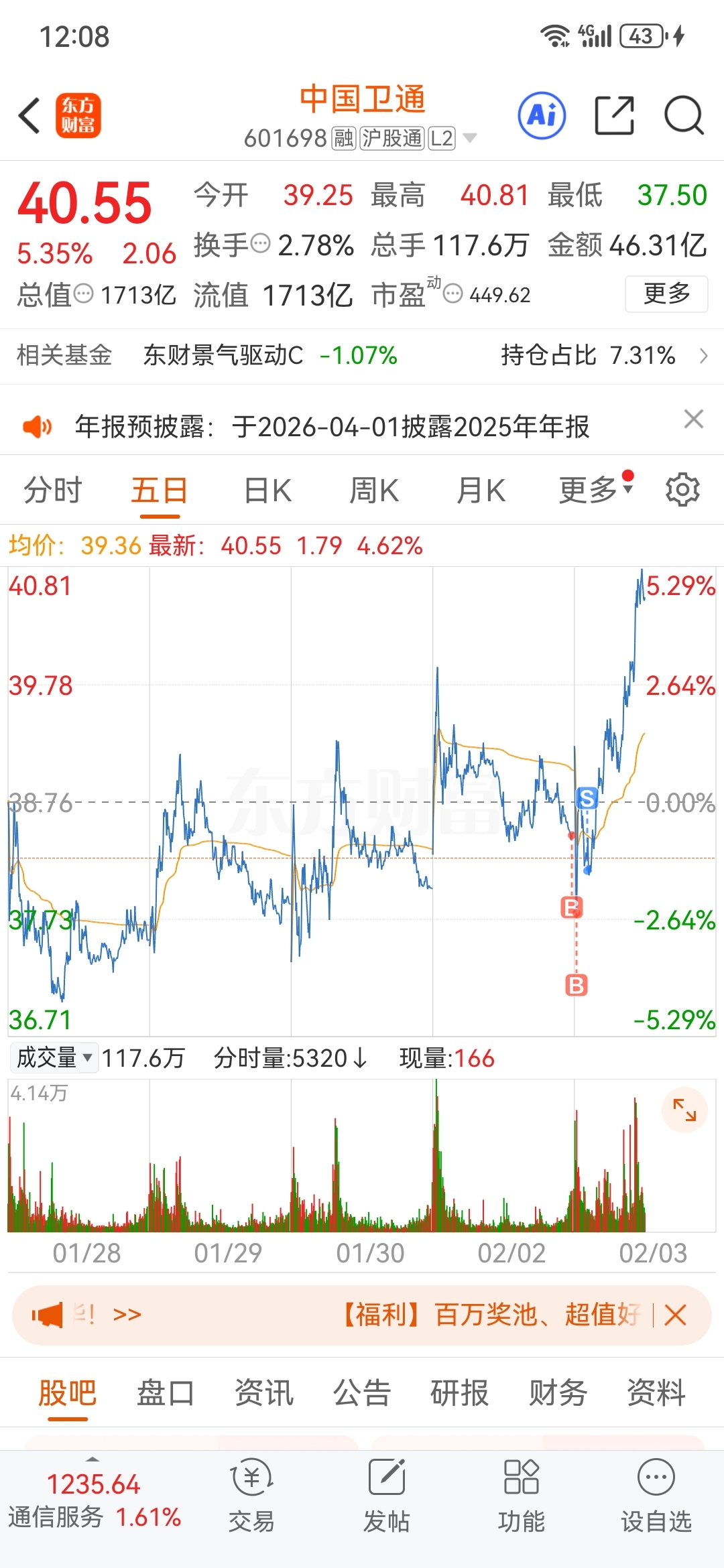 $中国卫通(SH601698)$ 还是T飞了