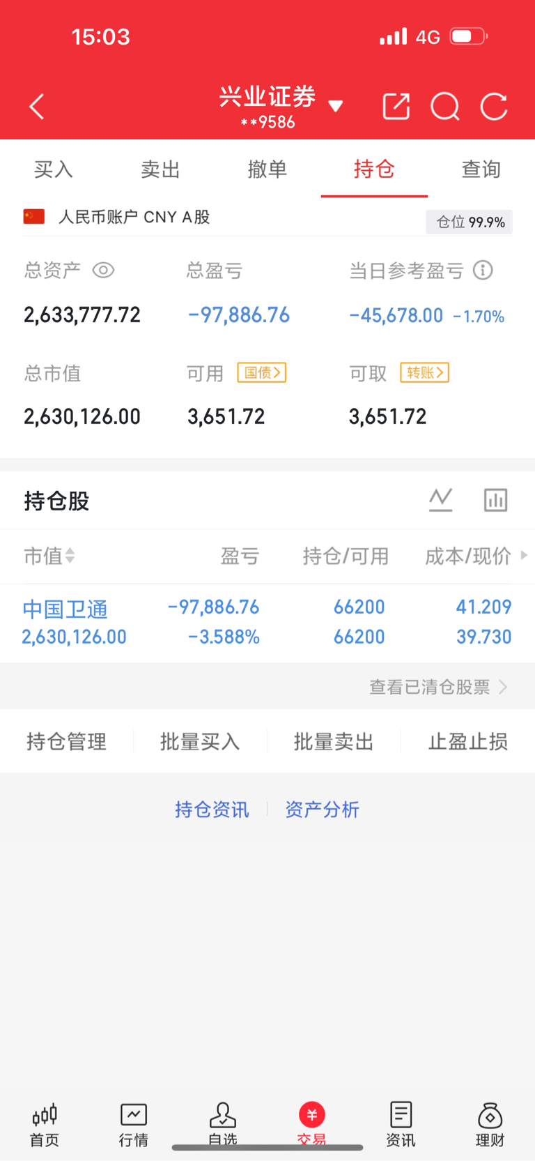 $中国卫通(SH601698)$ 打卡下班,没办法今天低开,本来是期待今天能回本的,只能看明天了,希望明天不要让我失望,没有点关注的兄弟姐妹可以关注一下。