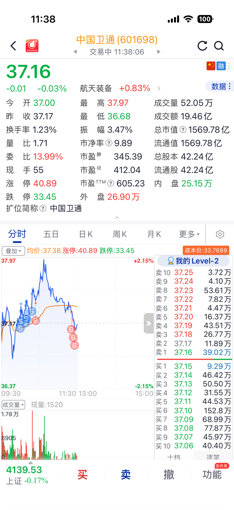 $中国卫通(SH601698)$ 今天有失水准!没有卖在高处,没有买在低点!主力下午下来在买点!