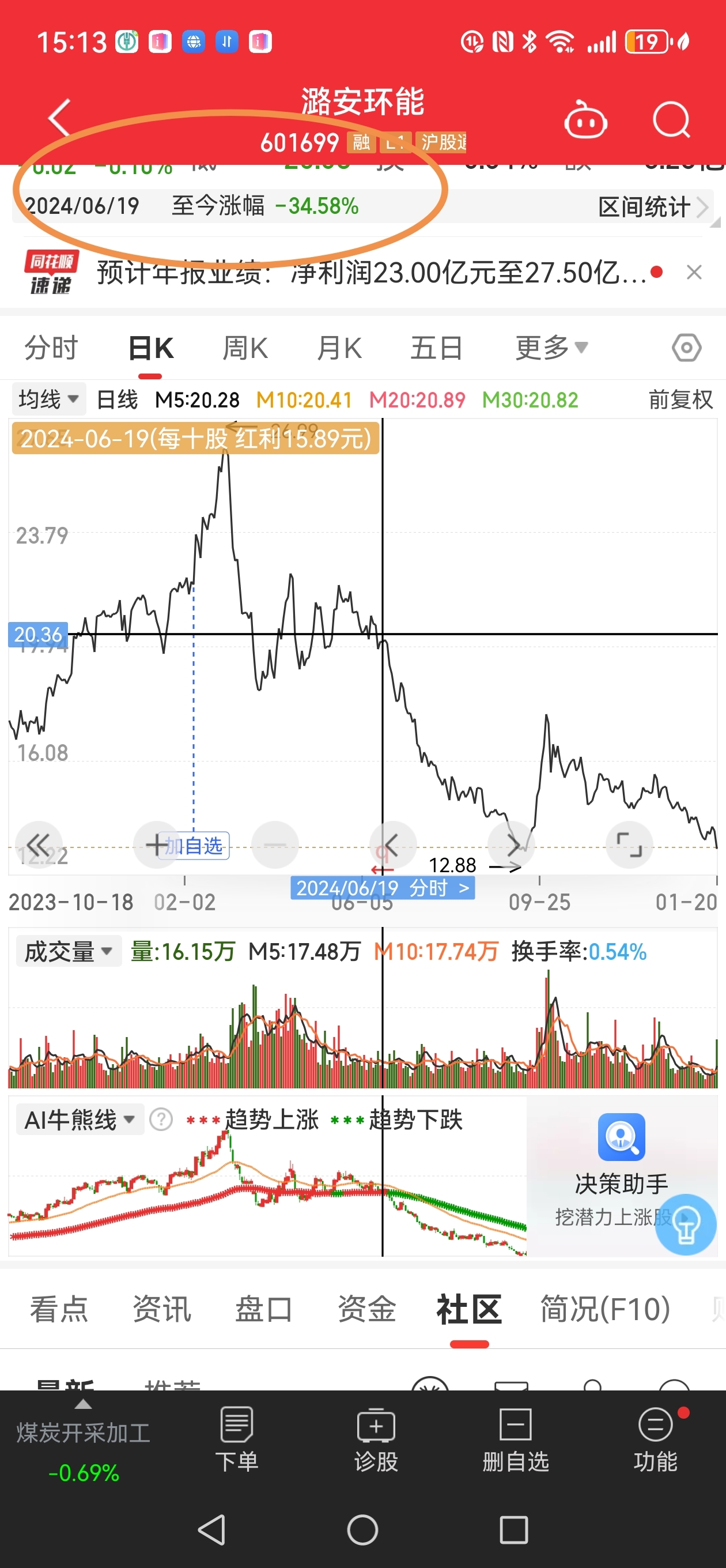 2024年6月19日分红除权,至今跌了近35%,分红不填权还贴权。潞安环能股息率