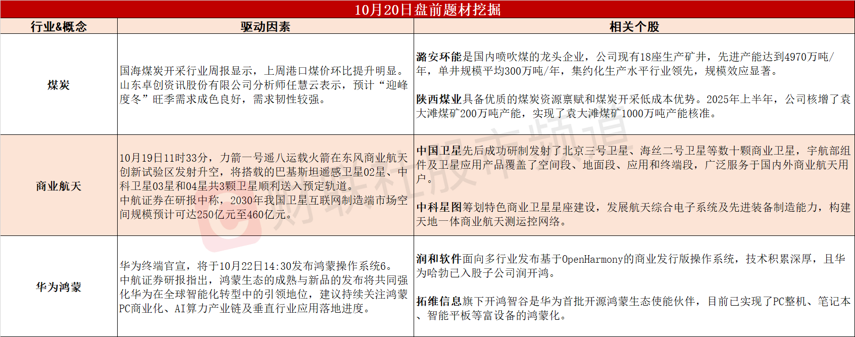①煤价大幅上涨,分析师预计“迎峰度冬”煤炭旺季成色良好。②火箭 “批量上天”,我国商业航天将迈入规模化爆发期。③华为将发布鸿蒙操作系统6,鸿蒙生态链有望站上风口。
