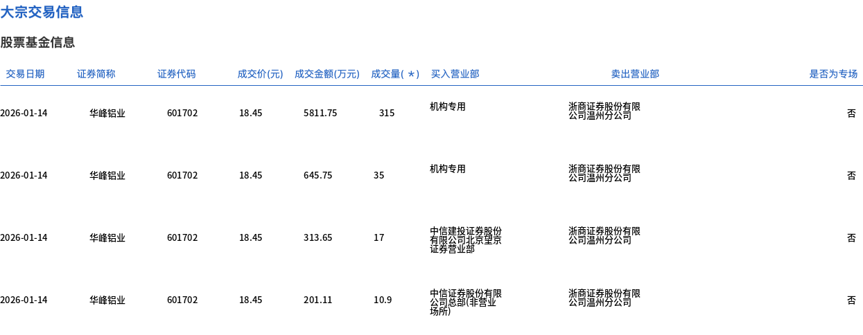 华峰铝业今日大宗交易折价成交377.9万股,成交额6972.26万元