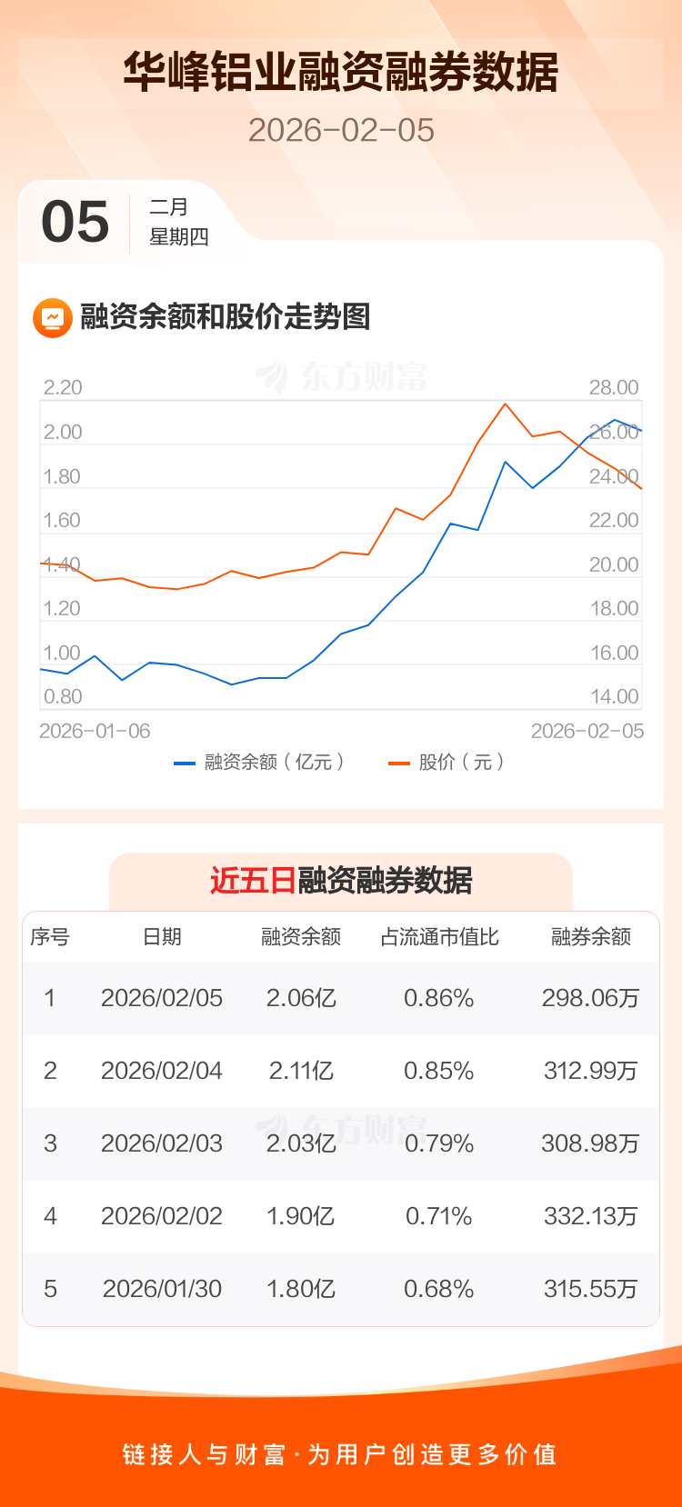 交易所最新数据显示,华峰铝业于2026年2月5日获融资买入1658.21万元,融资偿还2112.35万元,当日融资净偿还454.14万元。目前,该股融资余额2.06亿,占流通市值比例为0.86%。