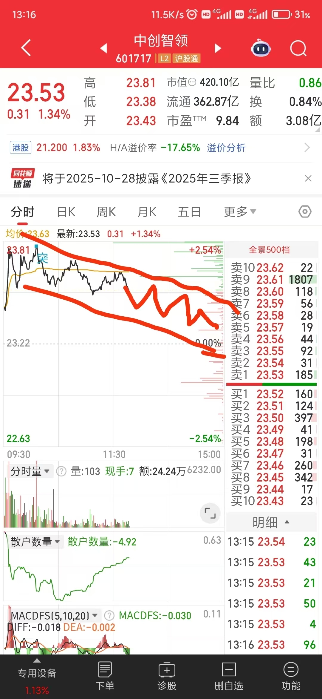 $中创智领(SH601717)$ 已破30日线,接下来就是60日线了,今天图形已写好,老奶奶下楼梯