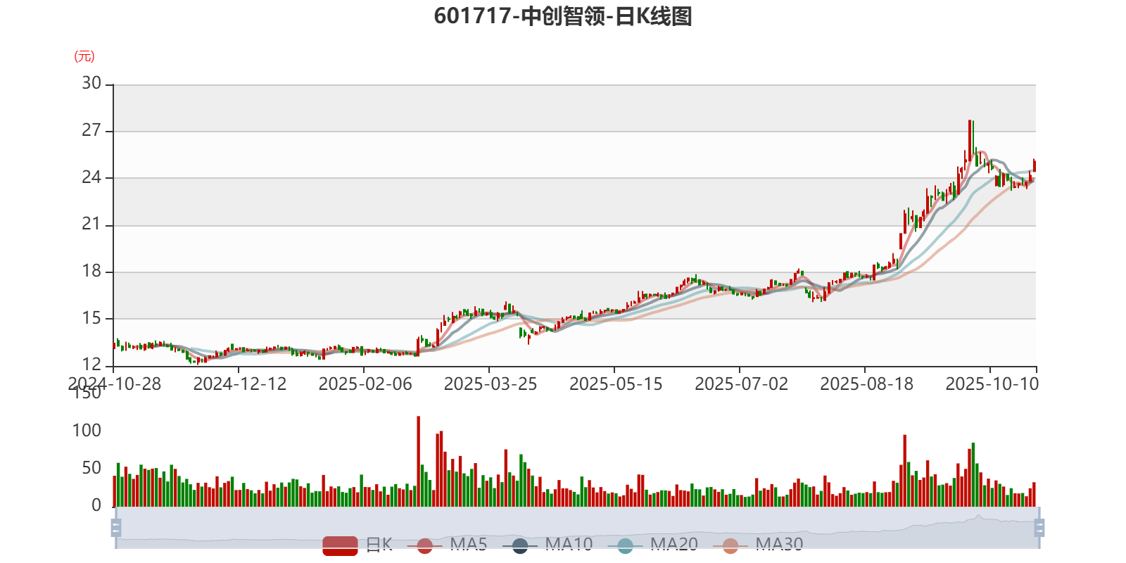 中证智能财讯中创智领(601717)10月28日披露2025年第三季度报告。前三季度公司实现营业总收入307.67亿元,同比增长10.45%;归母净利润36.45亿元,同比增长19.17%;扣非净利润31.55亿元,同比增长13.77%;经营活动产生的现金流量净额为8.78亿元,同比下降62.71%;报告期内,中创智领基本每股收益为2.075元,加权平均净资产收益率为16.01%。