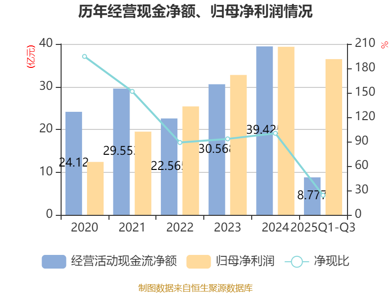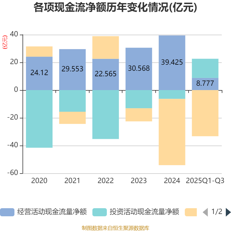 2025年前三季度,公司经营活动现金流净额为8.78亿元,同比下降62.71%;筹资活动现金流净额-33.29亿元,同比减少8983.54万元;投资活动现金流净额13.83亿元,上年同期为-6.29亿元。