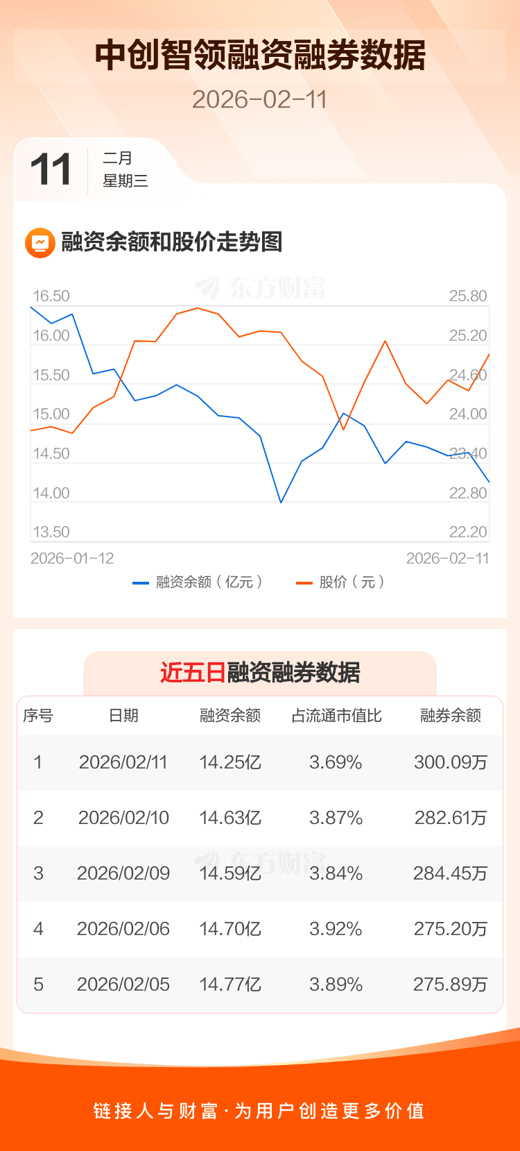 交易所最新数据显示,中创智领于2026年2月11日获融资买入4081.01万元,融资偿还7892.85万元,当日融资净偿还3811.84万元。目前,该股融资余额14.25亿,占流通市值比例为3.69%。