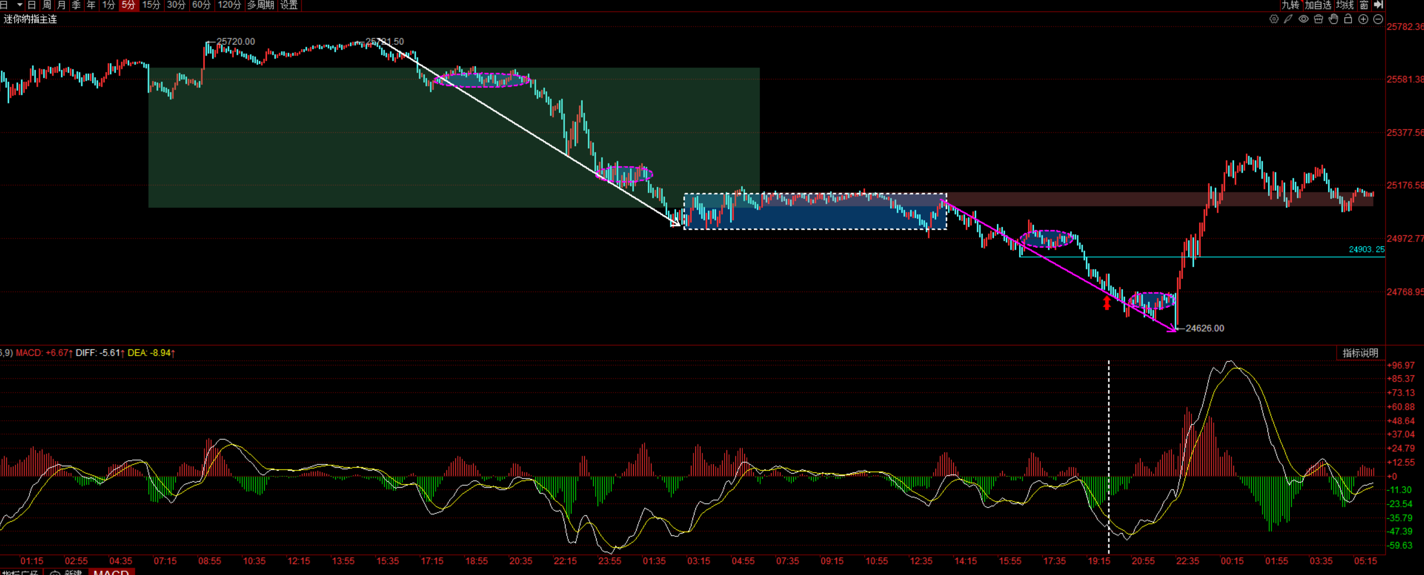 判断出5分钟趋势背驰要出买点了,判断出至少反弹到上一中枢的波动最低点24903.但是为何没有严格按照技术执行?!双红色箭头就判断做多?!白色中枢比较进入段(白色)和离开段(粉色)是否背驰。技术理论比较的是白色和粉色的趋势完成后的。(都有两个粉色椭圆的小中枢)而红色双箭头那里,MACD虽然绿柱缩短可是黄白线挑头反转了吗?为什么没有按照理论区间套的定义严格执行?即使光看5分钟图,粉色最后的背驰段,内部结构在双红色箭头那里完成了其两个中枢(粉色椭圆)的结构了吗?粉色这段看MACD 经历了两次回抽0轴了吗?(两粉色椭圆中枢的完成指标呈现)。而这和一个股票上涨的加速出货阶段。放量,缩量,再放量最后诱多(转折点该级别的1卖点)不一样吗?方向反着而已,MACD,绿柱放量,缩量,再放量,黄白线也是两次远离,第二次比第一次还远。之后股价新低都上0轴还是红柱了。